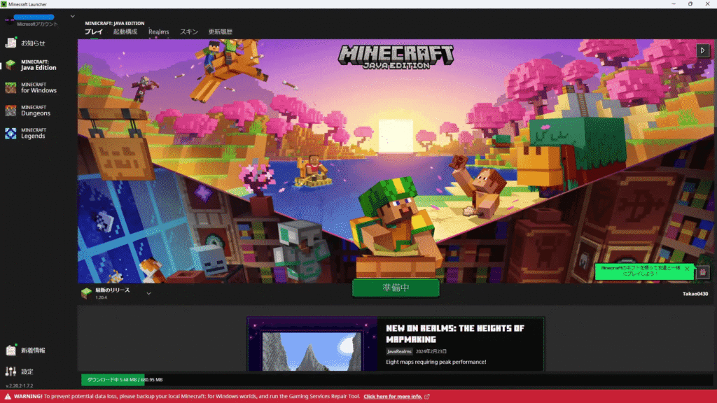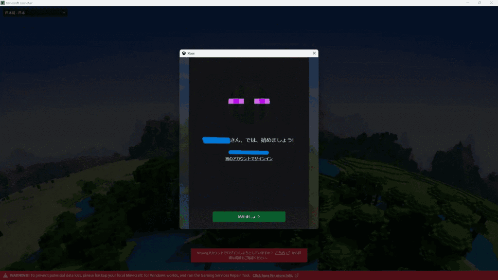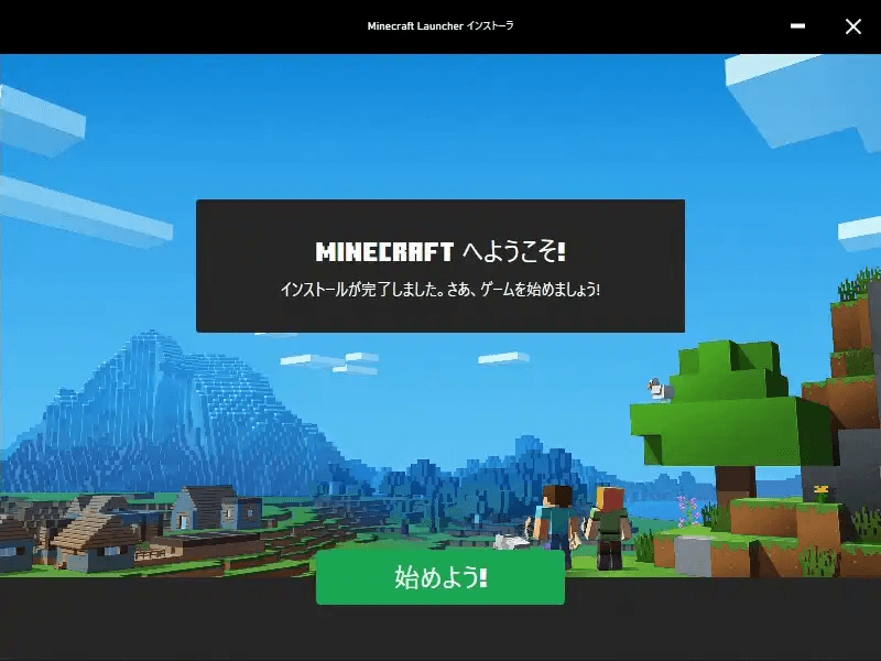 そのまましばらく待っていると下記のような画面が出てくるので、「始めよう!」をクリックするとMinecraftをプレイするためのランチャーが起動します。