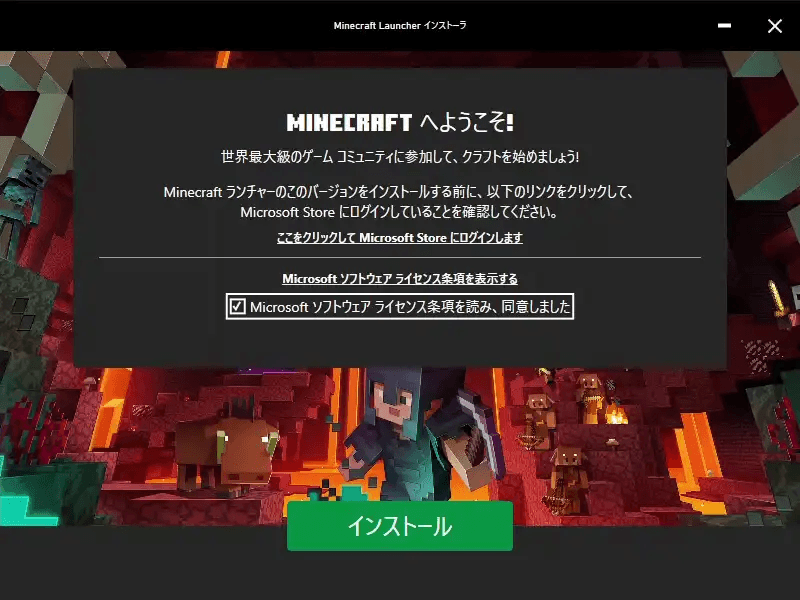公式サイトからダウンロードしたMinecraftのインストーラを起動します。