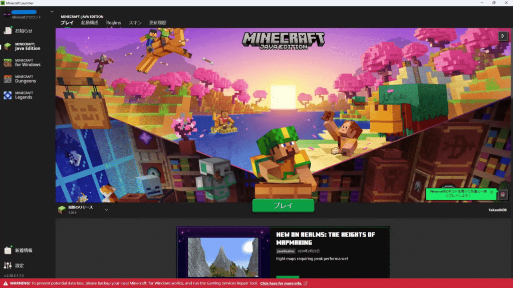 基本的にMinecraftの最新バージョンをプレイしたい場合は真ん中の「プレイ」をクリックするだけで、ゲームを起動できます。