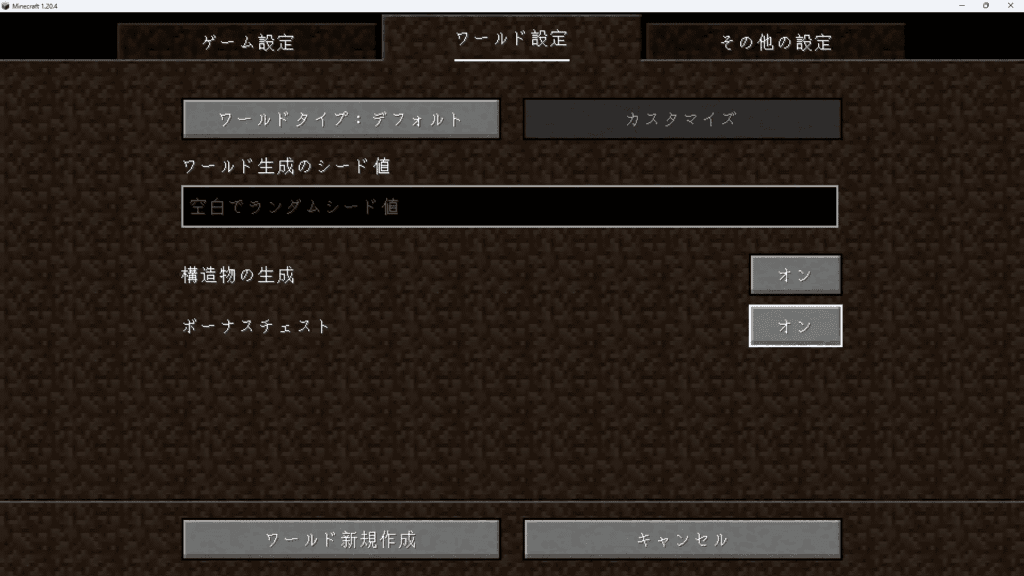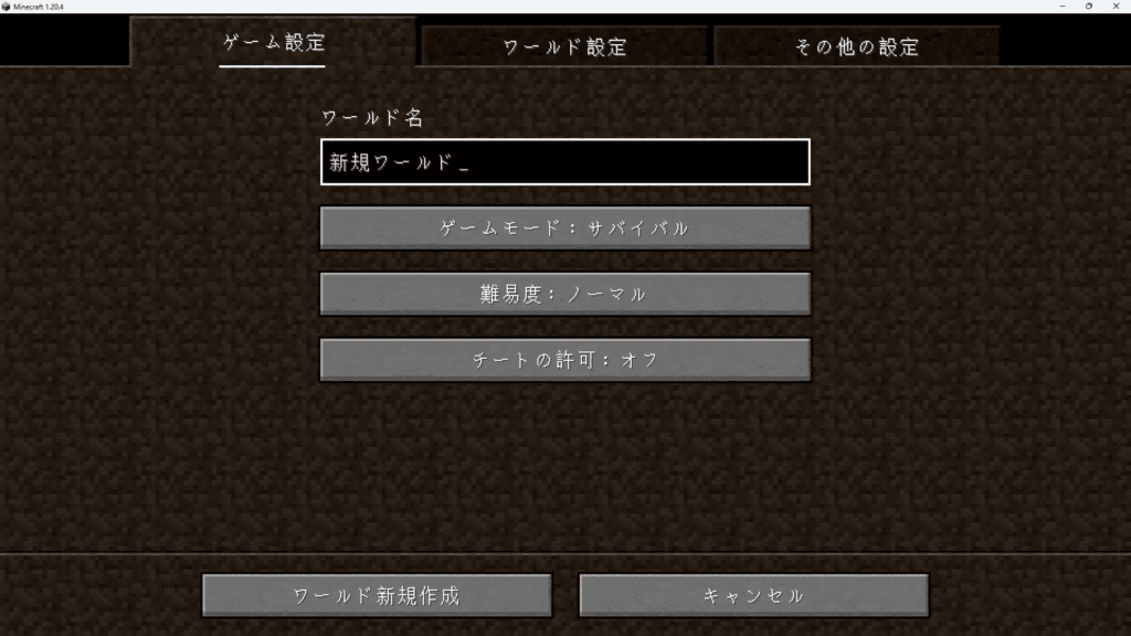 「ワールド新規作成」をクリックすると、ゲームが始まります。