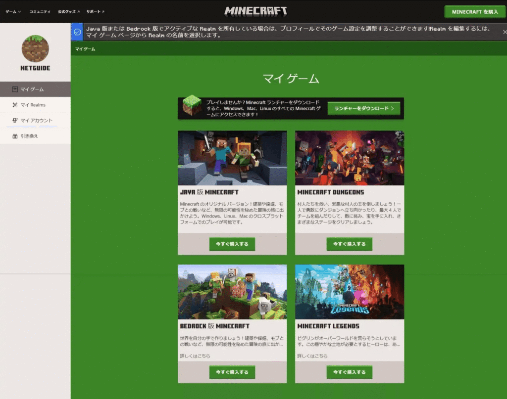 マイゲーム画面に移動するので、Java版Minecraftの今すぐ購入ボタンを押します。